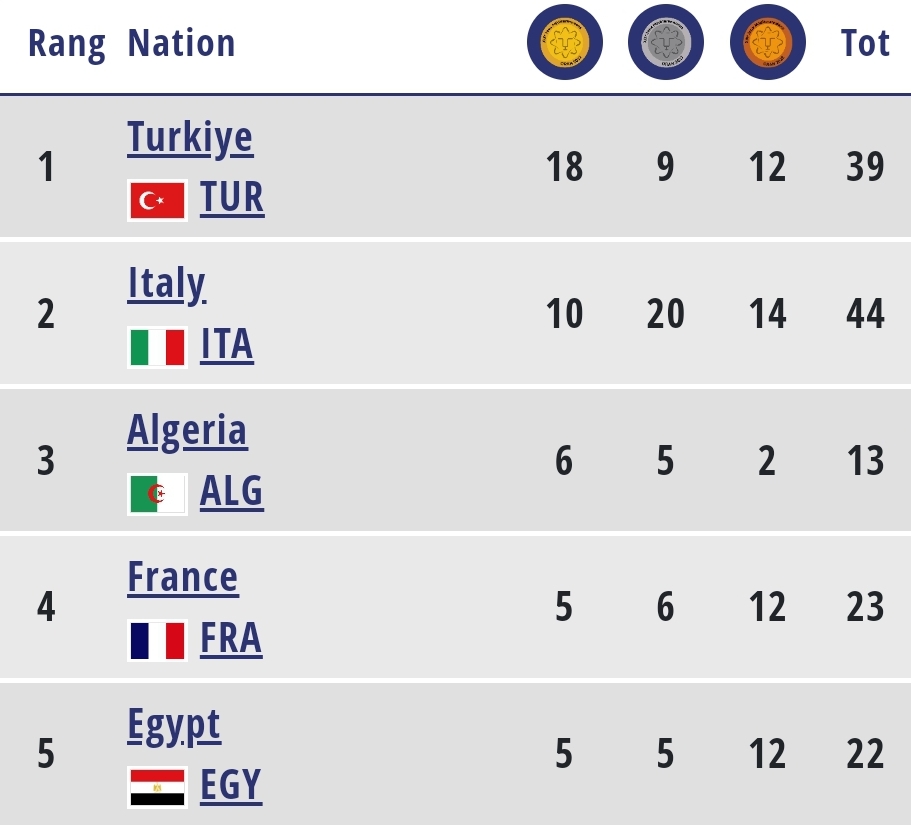 Algeria end day four in third place with 13 medals. Both Turkey (39 medals) Italy (44 medals) make huge jumps to battle it our for top spot.